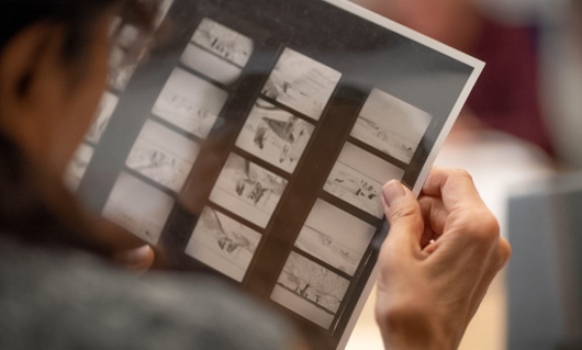 Archival images and text are reviewed during a visit to the Anchorage Museum's Atwood Resource Center.