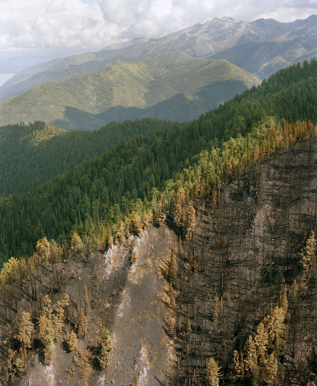 The smell of smoke in the air is becoming stronger — so we are nearing the dropping site. The fire has been contained and they are now engaged in damping down, but a huge area has burnt out. All sense of scale vanishes. Only when we fly over the parachutists’ miniscule tents do you get an idea of how much forest has burned there.