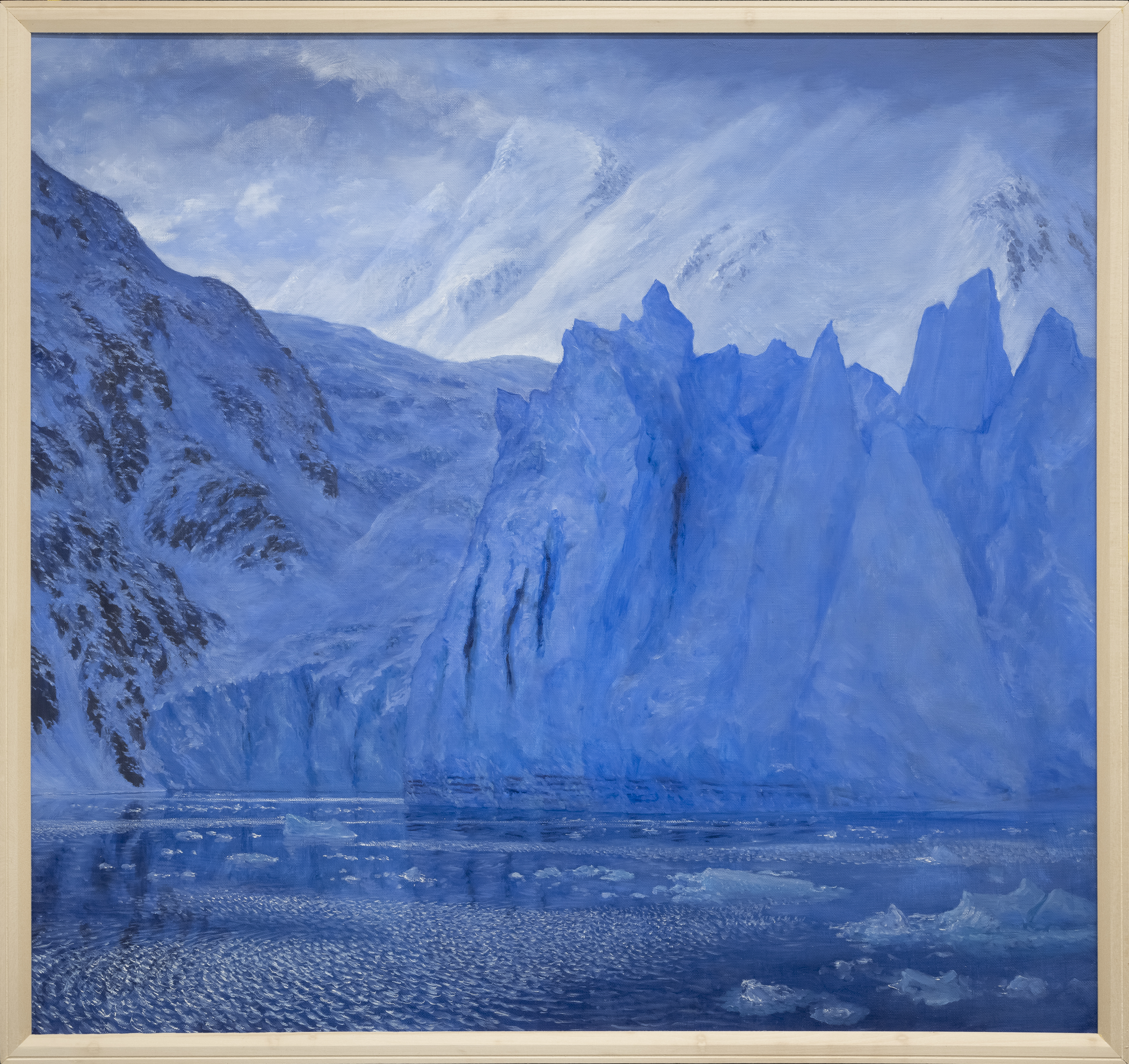 In addition to glaciers and ice fields in Alaska, the exhibition also features scenes from the artist’s time on scientific research trips in Antarctica, Greenland, and the Northwest Passage. The paintings are based on information from historical and scientific texts and extrapolation from Rosenthal’s observations and field sketches.